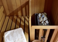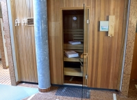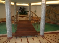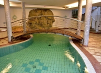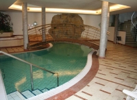 bazén nepravidelného tvaru s lehátky, sauna, 2x hydromasážní vana*, solárium*