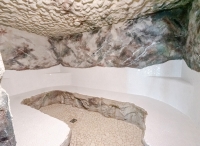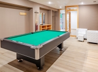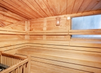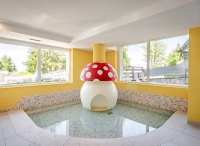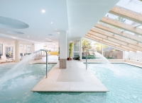 bazén 104 m² atypického tvaru s protiproudem, umělým vodopádem a lehátky, dětský bazének 10 m² s lehátky, vířivka až pro 9 osob, sauna, aromatická sauna, pára, termárium, 4x multifunkční sprcha, horizontální solárium*, relaxační koutek s lehátky, Kneippův chodník, masáže*, kosmetické služby*, posilovna