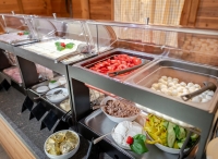 servírované menu s výběrem ze 3 teplých předkrmů a 3 hlavních jídel s přílohou, studené předkrmy, saláty, dezerty a ovoce formou bohatého bufetu, nápoje za poplatek; 1x týdně typicky místní večeře; v rámci společné večeře dětí bez rodičů nejsou teplý předkrm a hlavní jídlo s přílohou servírovány, ale je k dispozici malý bufet s 1 teplým předkrmem, 1 polévkou, 1 hlavním jídlem s přílohou a servírován je 1 nápoj