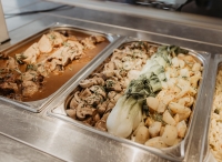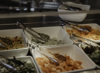 formou bufetu s výběrem hlavního jídla s přílohou, předkrmu či polévky, saláty a dezerty formou bufetu, nápoje za poplatek