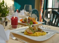 servírované menu s výběrem ze 2 až 3 hlavních jídel s přílohou, servírovaný předkrm či polévka, saláty a dezerty formou bufetu, nápoje za poplatek
