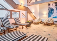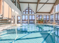 bazén atypického tvaru, sauna s panoramatickým výhledem, pára, relaxační koutek s lehátky, velká posilovna s cardio zónou, masáže*, kosmetické služby*, fyzioterapie*